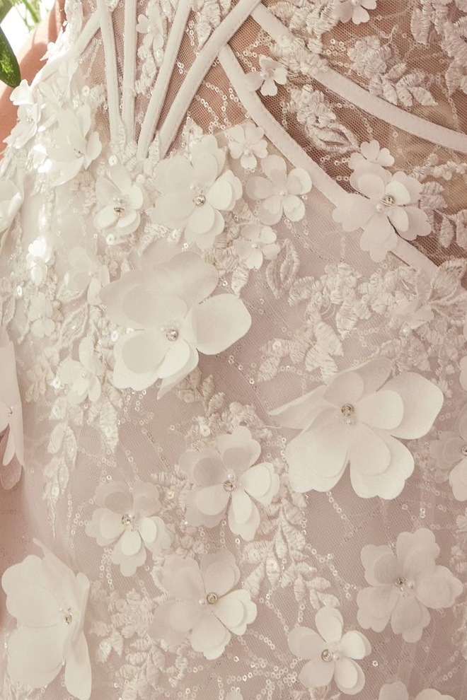 Delicate floral appliquรฉ and soft sequin embroidery create a dimensional finish, while the short hemline keeps the look fresh, playful, and fashion-forward. The sweetheart neckline adds softness, and the fitted skirt highlights the silhouette beautifully.