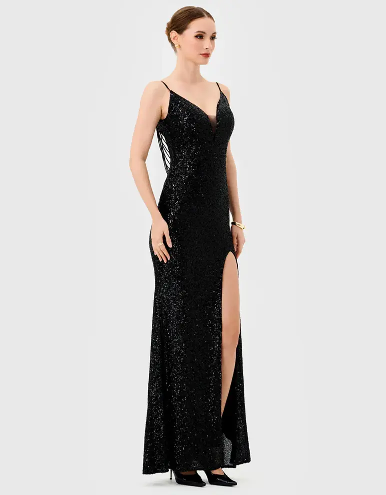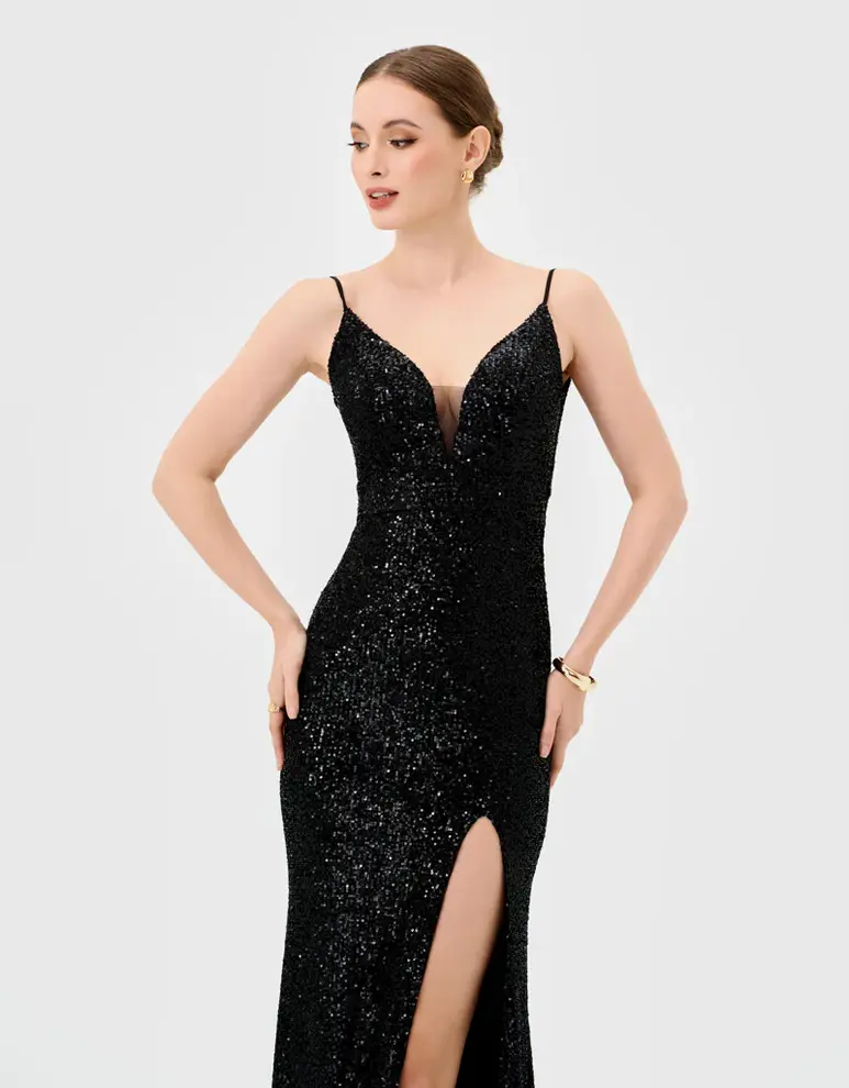 Make an entrance in the Inaya Plunge Neck Maxi BL81D32 by Bariano, a sleek black sequin evening gown designed to sparkle under every light. Featuring a plunging V-neckline anchored by a sheer mesh insert, this gown lengthens the torso. Spaghetti straps slide to a draped beaded back, adding sparkle. The structured bodice with bust cups defines the waist, and the fishtail skirt falls to the floor with a dramatic thigh-high split.