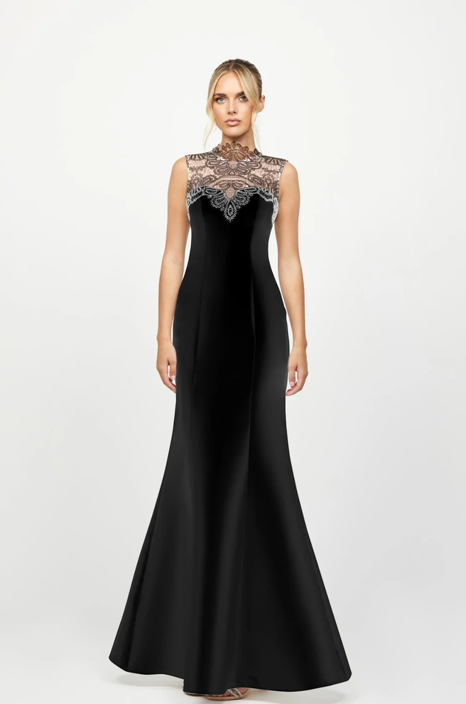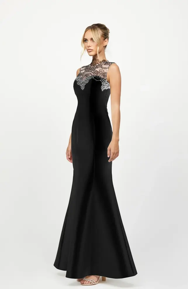 The Jana Lace High Neck Gown by Bariano Australia is the definition of refined elegance. This sleek black gown features a high lace neckline that adds delicate detail and timeless appeal.