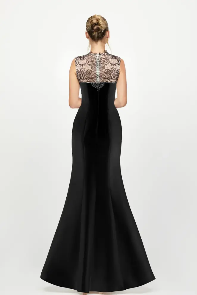 The sheer lace panel frames the neckline and shoulders, creating a sophisticated statement without overpowering the design. The back continues this detail, offering a cohesive and elegant look from every angle.