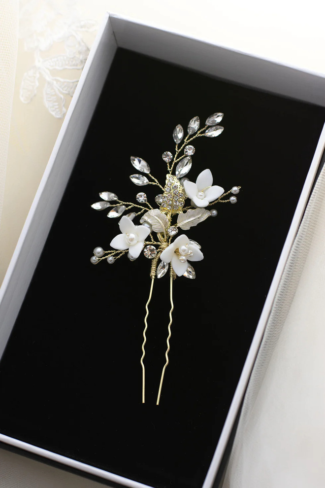A delicate hairpin made for our minimal brides. Lilith is a beautiful hair pin featuring white porcelain flowers and spring of navette stone crystal. Perfect for Brides, Bridesmaids, Flower Girls and formal occasions.