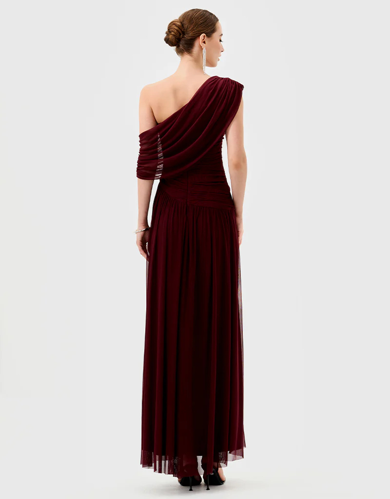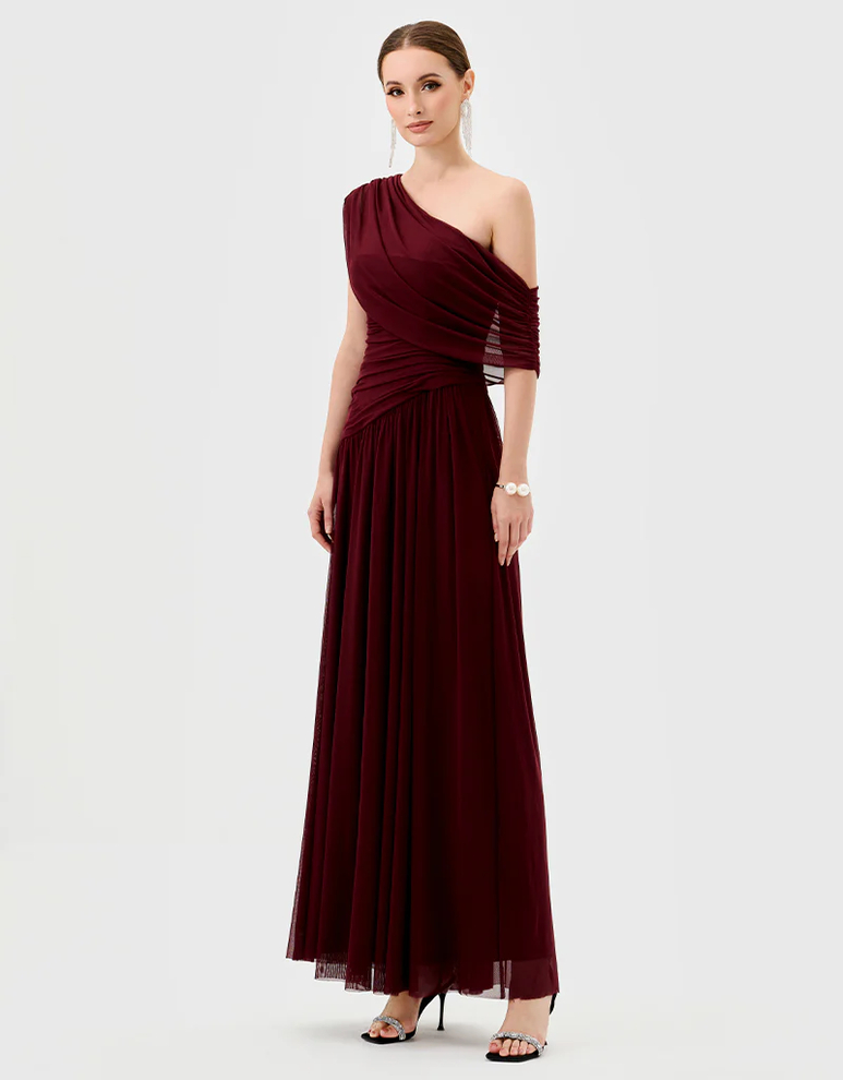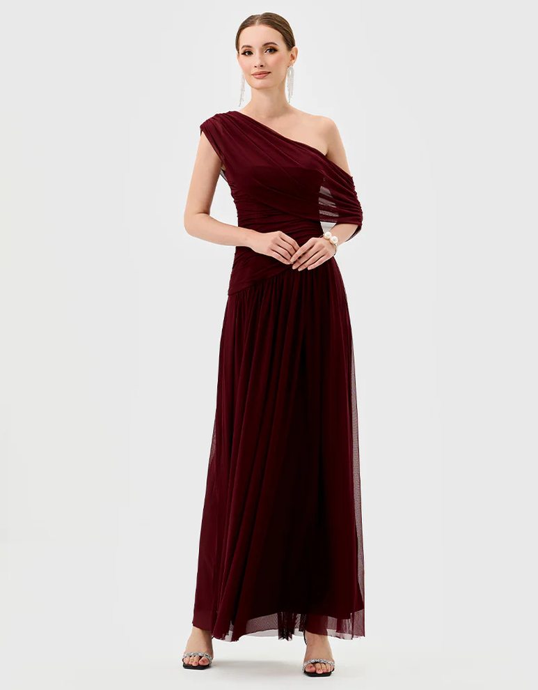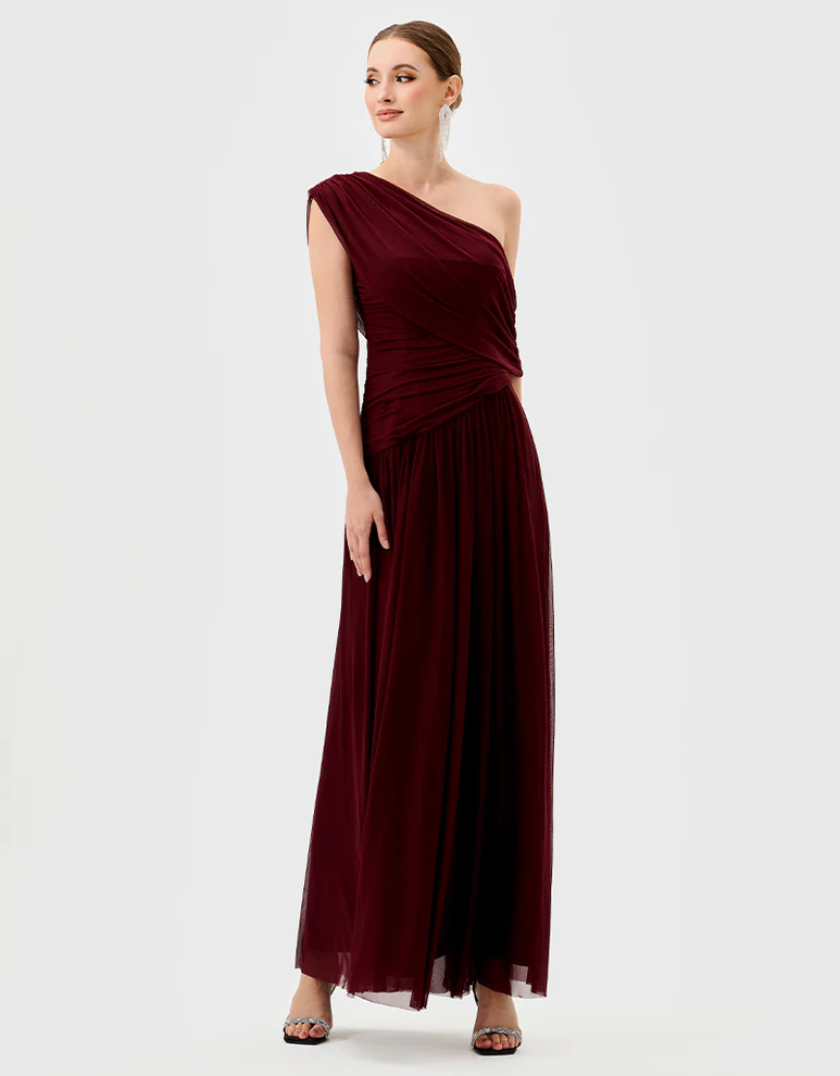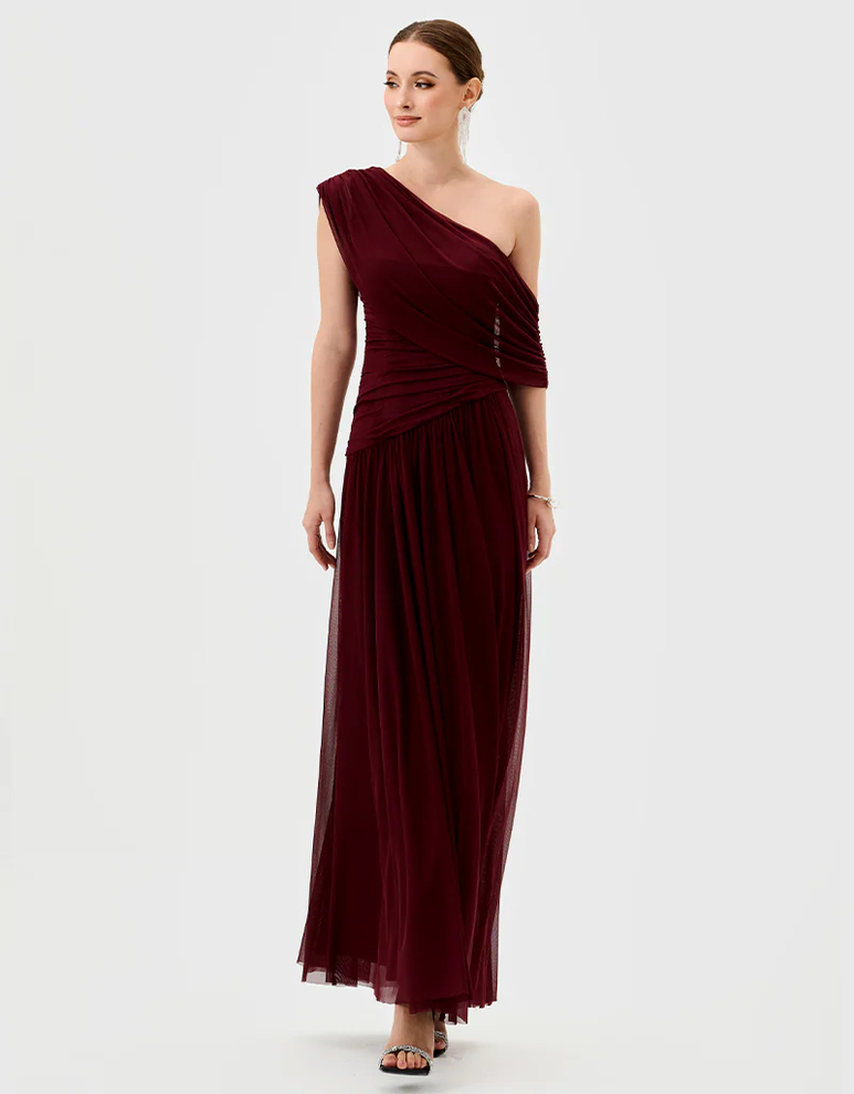 Meet Macie Draped Maxi BL28D31L by Bariano, a romantic one-shoulder maxi dress that floats as you move. Soft mesh is artfully draped across a sweetheart-effect bodice, creating flattering ruching that defines the waist before falling into a full, airy A-line skirt. Built-in cups provide gentle support, while the side invisible zip and full lining keep the finish clean and comfortable.