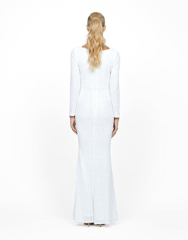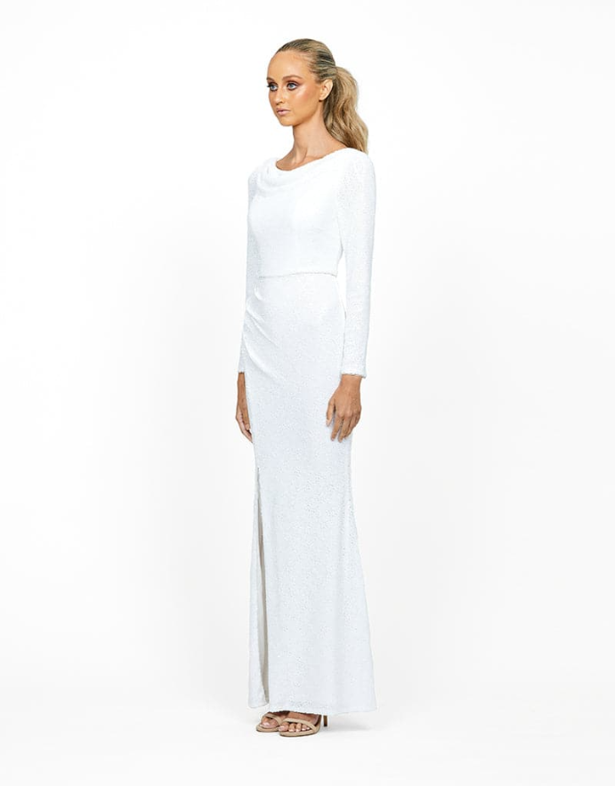 Moon Draped Long Sleeve Gown B55D10L by Bariano features a fully lined sequin gown with a high cowl neckline, draped skirt with front leg slit and a fitted waist.