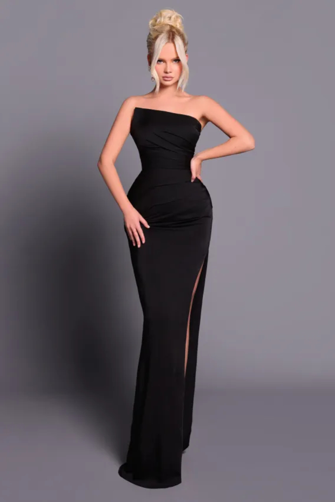 Sleek, sculpted and undeniably modernโNicoletta NBM2011 is the ultimate black formal gown. Crafted in smooth soft suiting, this strapless design features an asymmetrical neckline with elegant pleating, a structured bodice with boning and built-in cups, and flattering ruching through the waist and skirt. Finished with a bold thigh-high split, itโs made for confident entrances and effortless movement.