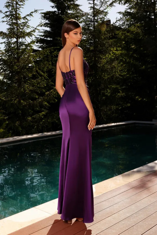 Turn heads in the Nicoletta NC2032 – a show-stopping evening gown that pairs a sparkling corset bodice with a sleek, draped skirt and a bold leg split. The rich plum tone is ultra-flattering, while the intricate black beaded appliquรฉ adds high-glam texture for formals, proms and black-tie nights.