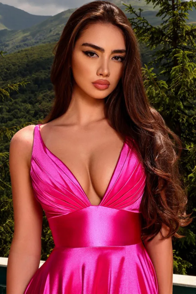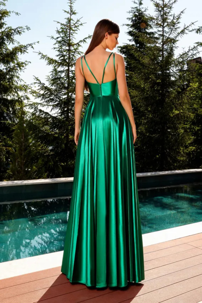 A sleek, high-impact satin gown in a rich emerald green, designed to flatter with a plunging V-neckline, pleated bust detailing, and a cinched wide waistband. The skirt falls into a full, flowing A-line with a dramatic thigh-high split for that perfect mix of elegant + fun.