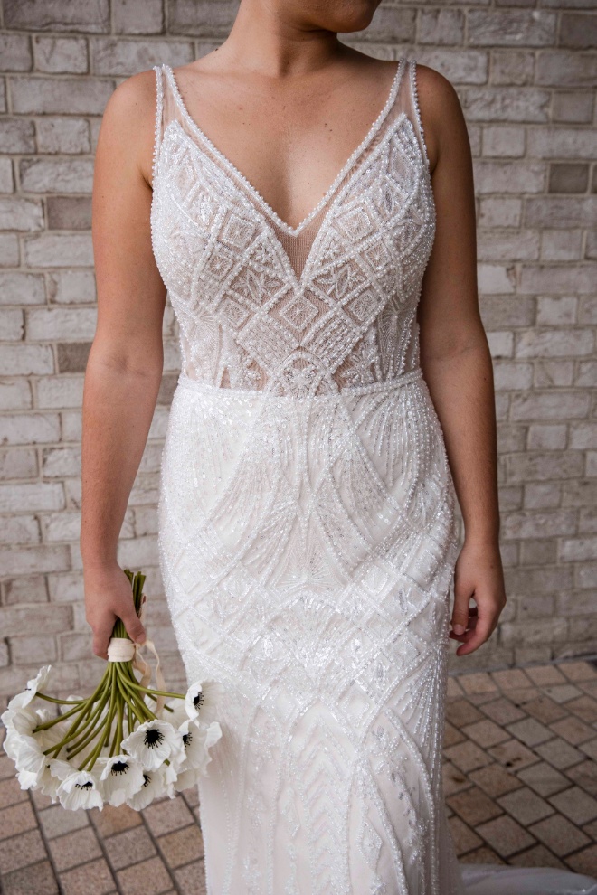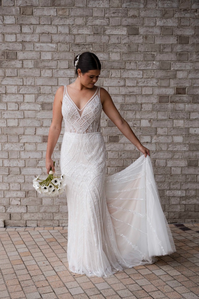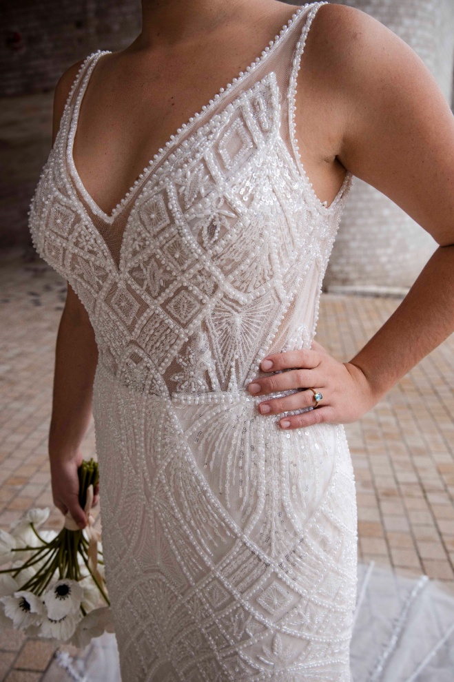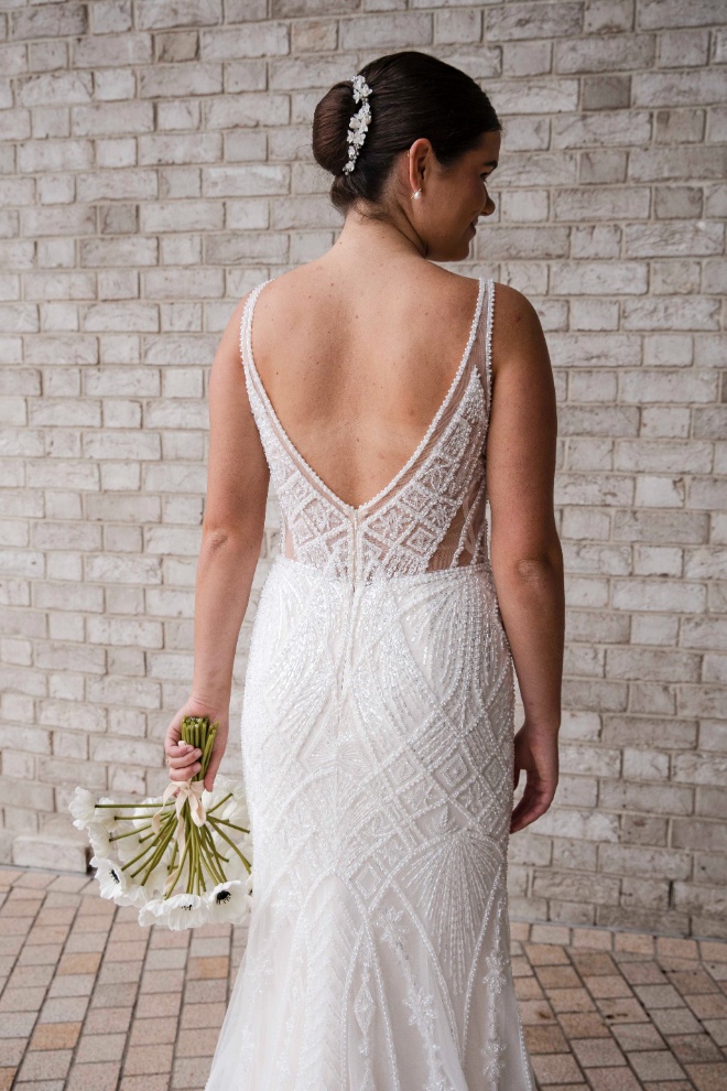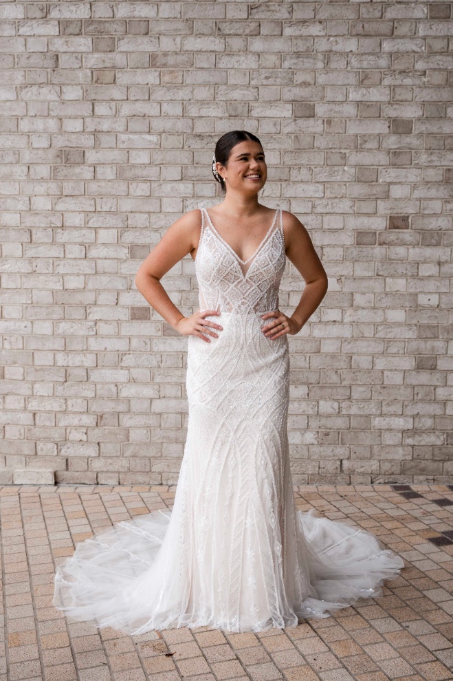 Meet Clementine, a shimmering showstopper from the RSVP Bridal Collection, crafted in beaded tulle with an elegant, figure-flattering fit. Designed for brides who love a little sparkle , Clementine features a clean, modern V-neckline with straps, a beautifully low V-back, and an all-over beaded pattern that catches the light with every step. The fitted skirt skims the body before flowing into a soft, tulle train finished with radiant beaded detailingโpure aisle magic.