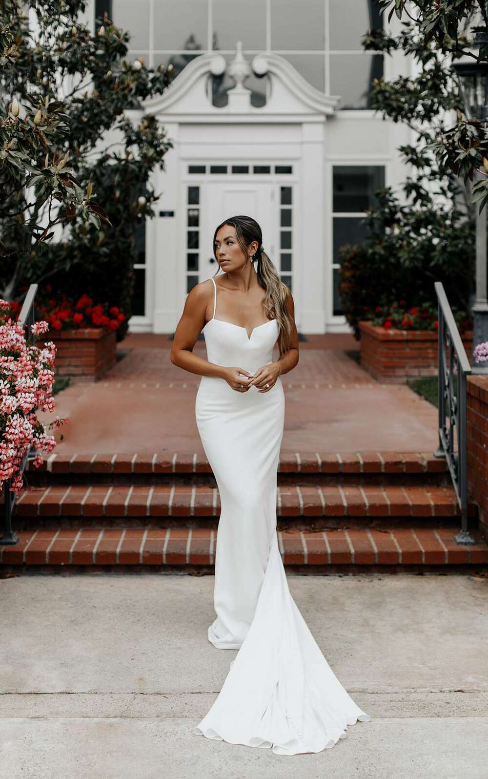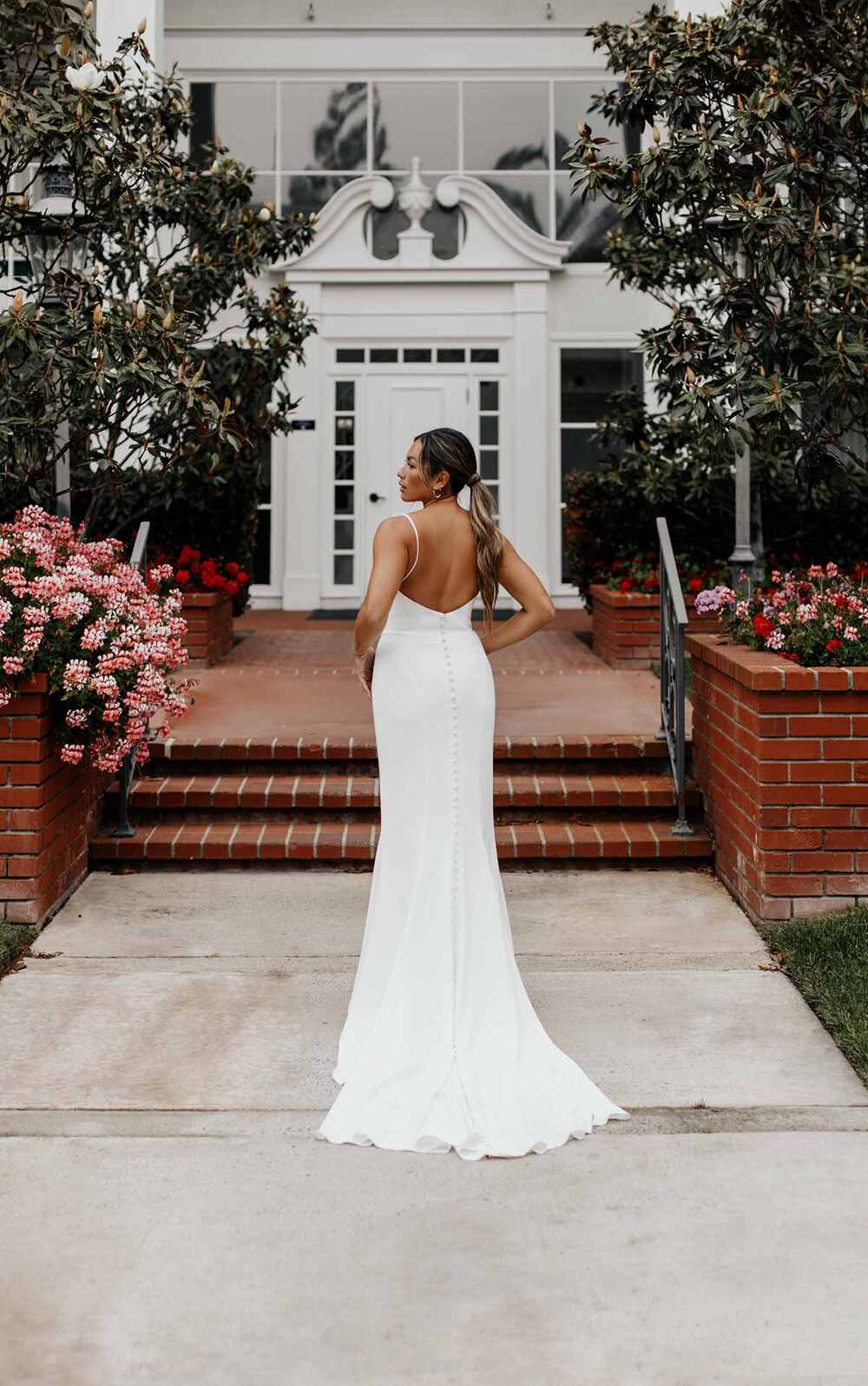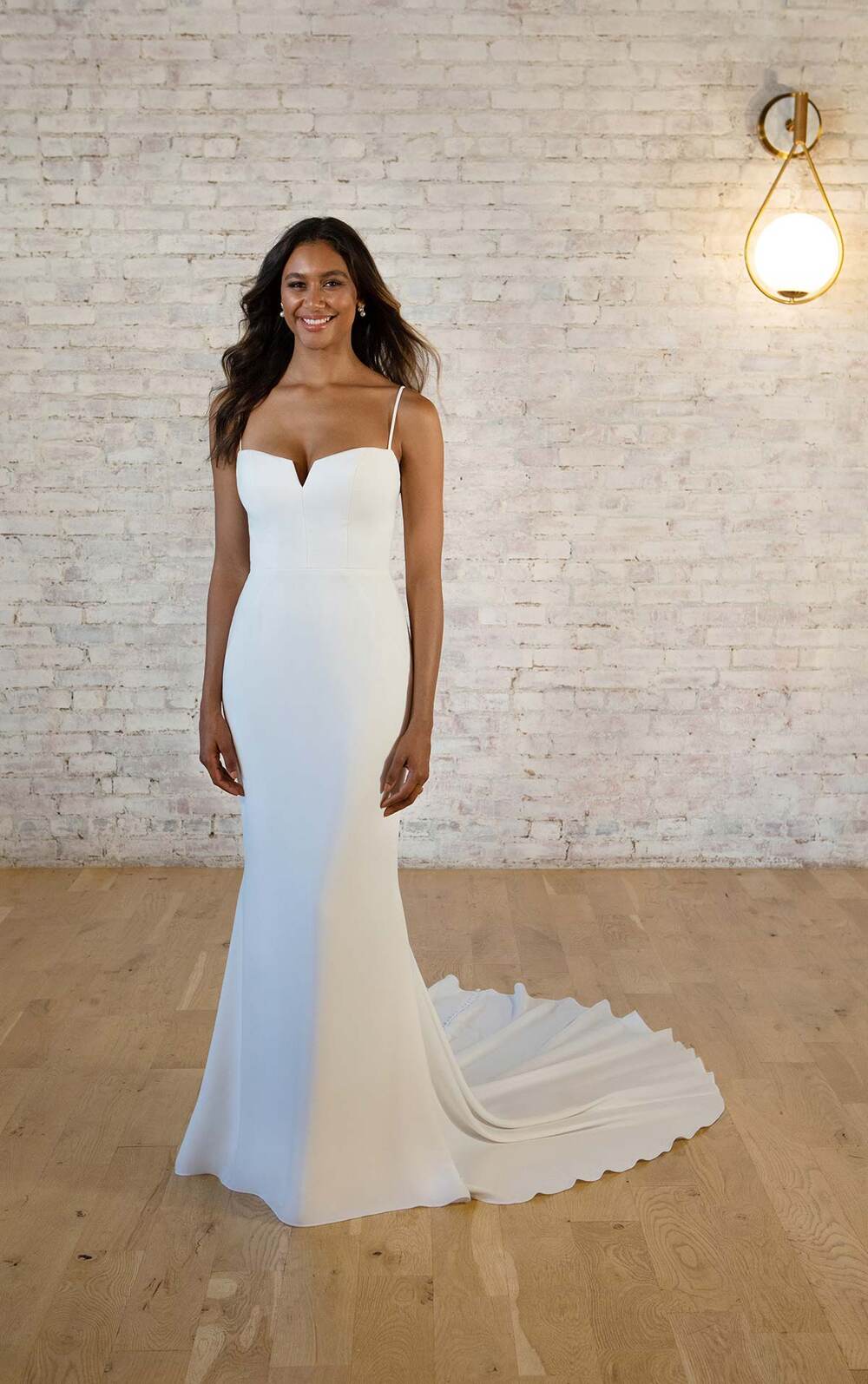 Exquisite and elegant, this sophisticated yet simple wedding dress has it all. From Stella York Style 7598’s delicately thin spaghetti straps, a modern notched neckline adds an architectural touch to the minimalist pure ivory crepe fabric. The clean and streamlined aesthetic is further enhanced by the contemporary column sheath silhouette that skims the natural curves of the body. From the low V-back detail, traditional fabric-covered buttons line the back of the wedding gown until meeting the sweeping train to complete this modern vision of sleek bridal fashion.