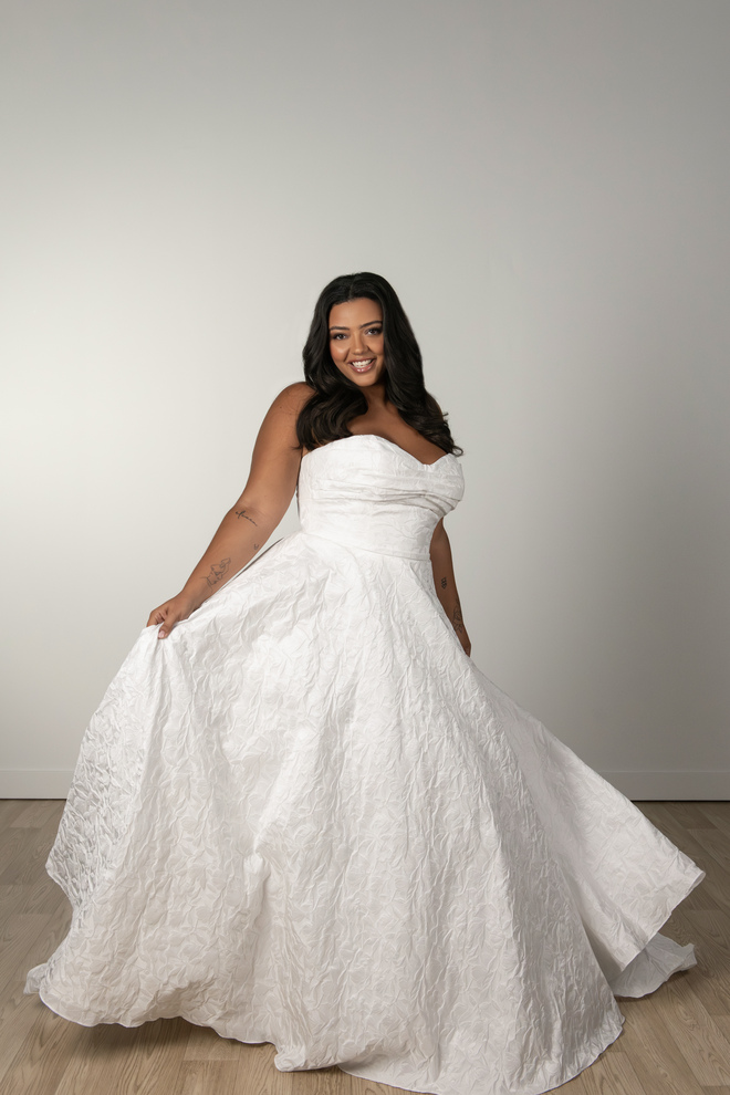 A modern masterpiece of sophistication, Stella York Style SY8059 reinvents classic bridal elegance with its sleek A-line silhouette. The ruched strapless bodice features a contemporary sweetheart neckline with a subtle twist, creating a sculpted effect that enhances the natural shape. Crafted from unique textured satin jacquard, this gown combines fashion-forward appeal with timeless charm. The A-line bodice transitions effortlessly into a voluminous ballgown skirt at the waist, striking the perfect balance of grace and glamour.